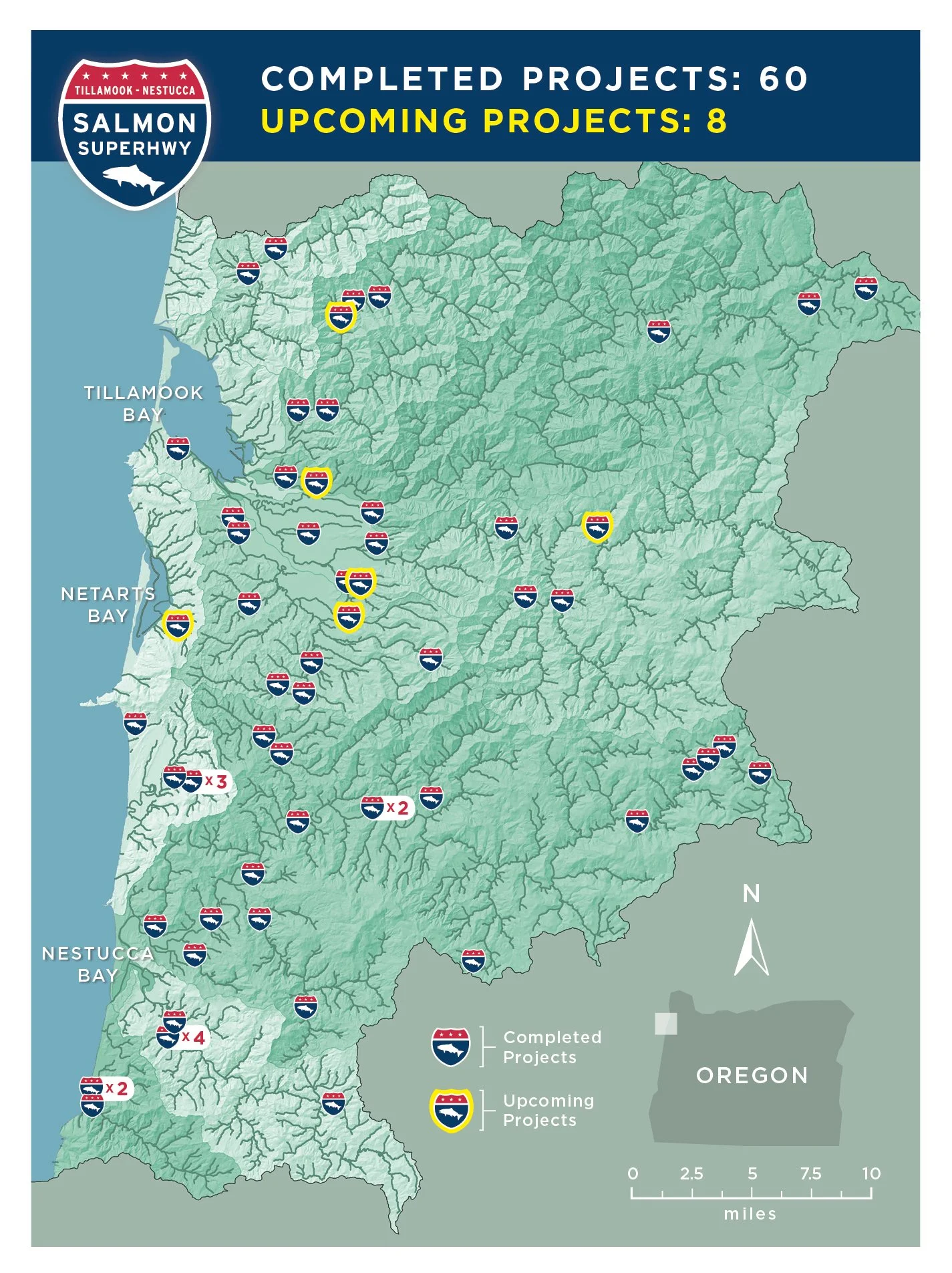 The continued collaboration and hard work of Salmon SuperHwy partners has resulted in tremendous progress toward our goal of 180 miles of habitat reconnected. The 60 projects completed have restored access to 137 miles of spawning and rearing habitat for Chinook, coho, chum, steelhead, cutthroat trout, and lamprey, and on top of that, they’ve made Tillamook County’s transportation system safer for residents, visitors, and industry. We’re making a big push to keep that momentum going until we reach our goal.