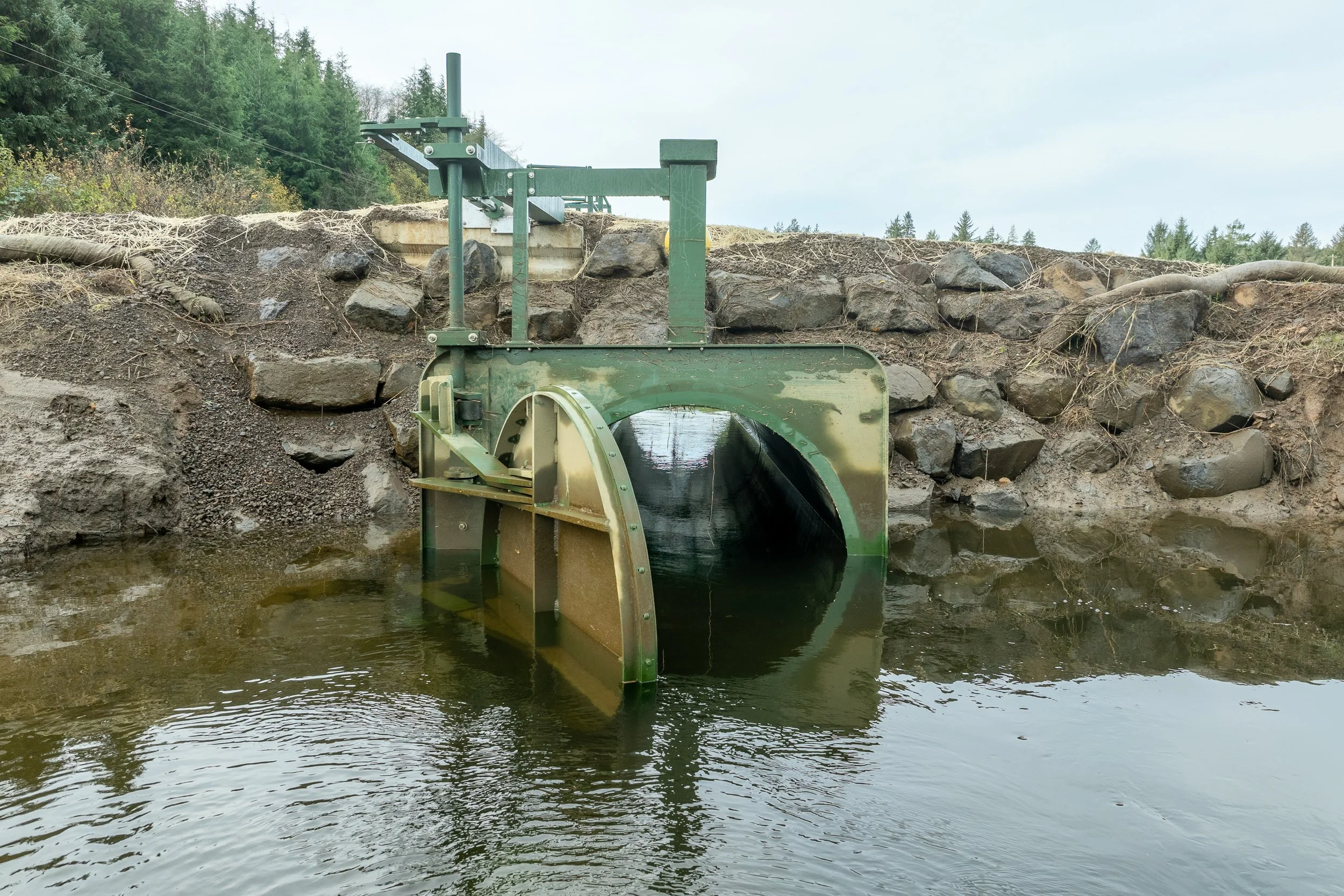 The new tide gate is fitted with a Muted Tidal Regulator (MTR) with marine grade aluminum piping 58’ long and 6’ in diameter to meet fish passage standards.
