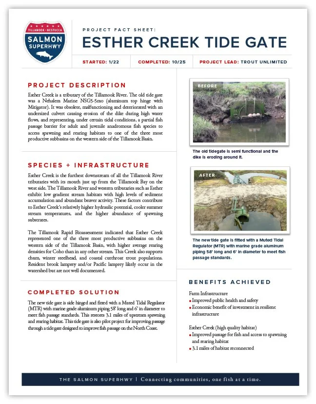 The Esther Creek Tide Gate Project was successfully implemented with the close collaboration of Salmon SuperHwy partners. Federal and state agencies along with local non-profits and private landowners combined technical skills and funding to reopen this important local road and reconnect high quality spawning and rearing habitat for Oregon’s anadromous fish.