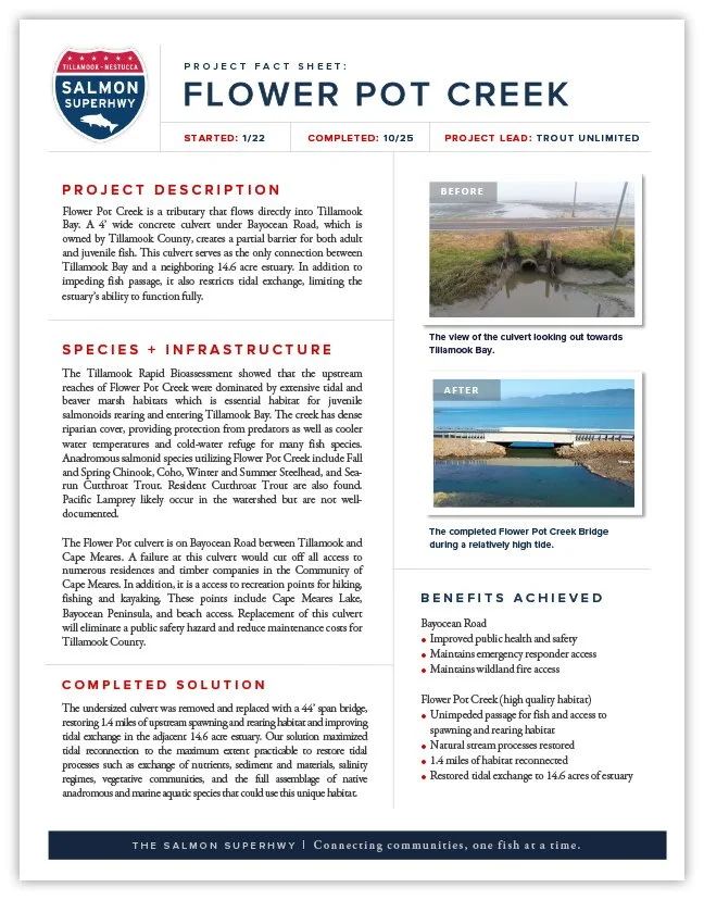 Flower Pot Creek is a tributary that flows directly into Tillamook Bay. A 4’ wide concrete culvert under Bayocean Road, which is owned by Tillamook County, creates a partial barrier for both adult and juvenile fish. This culvert serves as the only connection between Tillamook Bay and a neighboring 14.6 acre estuary. In addition to impeding fish passage, it also restricts tidal exchange, limiting the estuary’s ability to function fully.